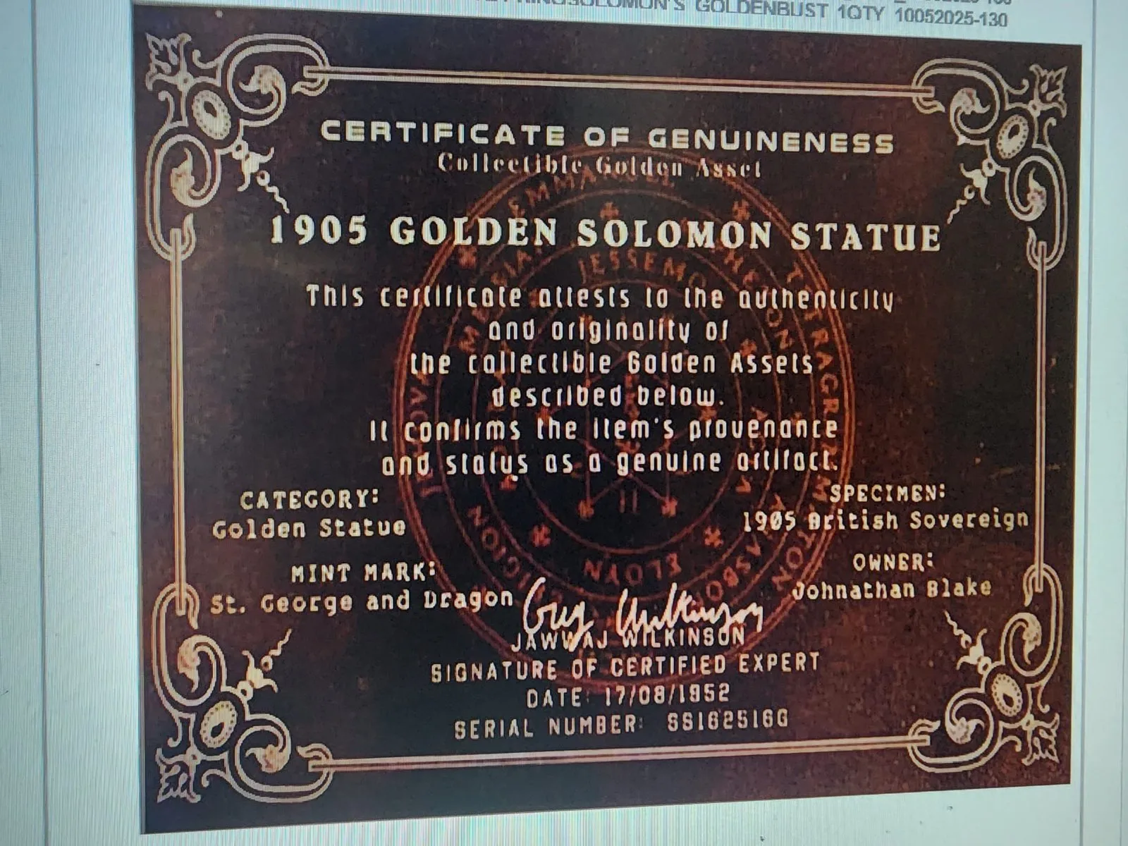 A seller operating across several Facebook groups is attempting to market what he describes as a solid gold statue of King Solomon, valued at 4.2 billion dollars. The listing includes counterfeit certificates, invented historical claims, and photographs of what is clearly a modern decorative casting.